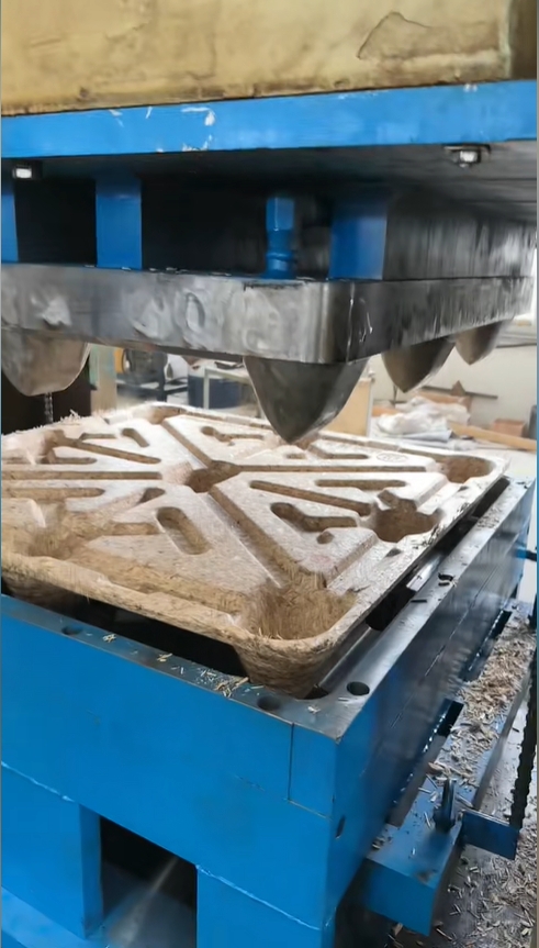 (8)經(jīng)模壓木屑托盤液壓機(2500噸四柱/框架壓力機)高溫高壓處理,一次模壓成型;